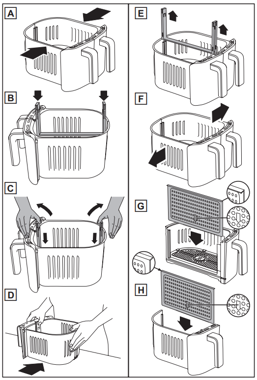 - Carefully pull the basket out of the appliance, place the ingredients inside, and push the basket back into the appliance. DO NOT touch the basket directly; only hold the basket by the handles.
