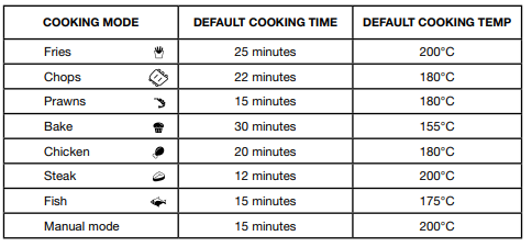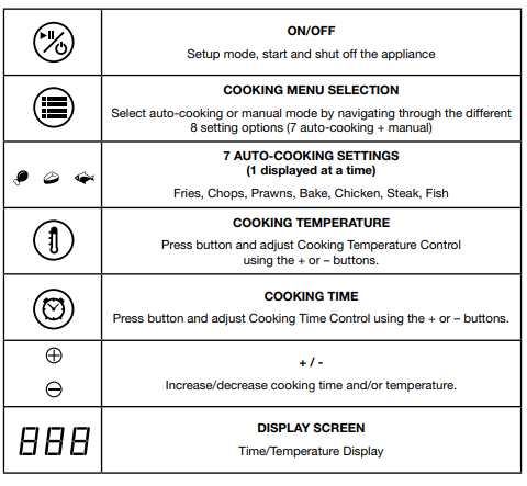The Air Fryer has 7 auto cooking functions with default cooking time/temperature, and manual mode with adjustable cooking temperature/time settings.