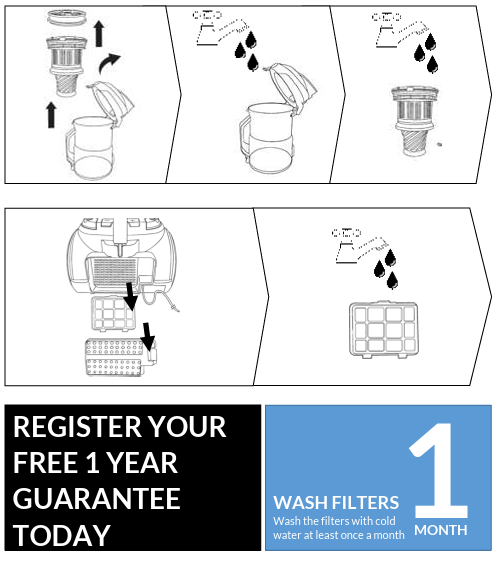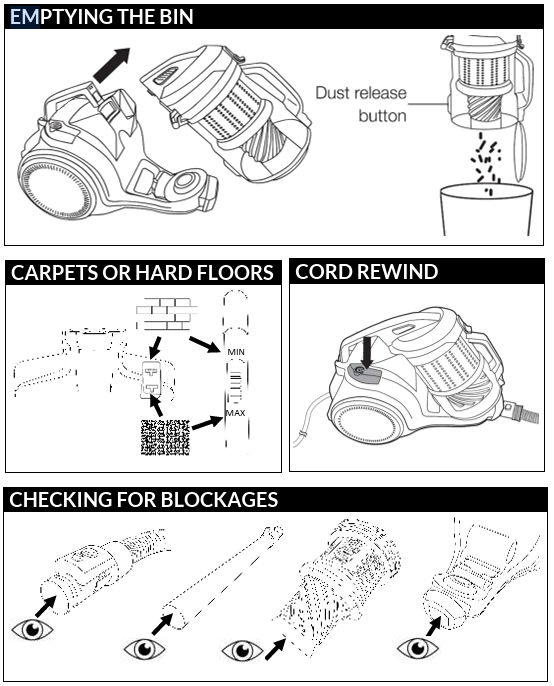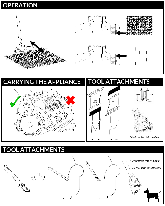 - Do not run the vacuum cleaner over any cables, or its own power cable. As this will result in damaging the cable. This product is intended for household use only. Do not use outdoors.