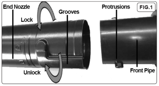 • To install the end nozzle, align the protrusions on the front pipe with the sliding grooves on the end nozzle and then slide it onto the front pipe and turn it anticlockwise to lock. To remove the end nozzle, install it in reverse.
