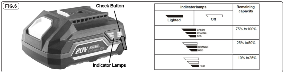 Press the check button on the battery cartridge to indicate the remaining battery capacity. The tool is equipped with a tool/battery protection system. This system automatically cuts off power to the motor to extend tool and battery life. The tool will automatically stop during operation if the tool or battery is placed under one of the following conditions: