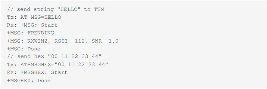 • AT+MSG=”Data to send” // Use to send d string format frame, which does not need to be confirmed by the server