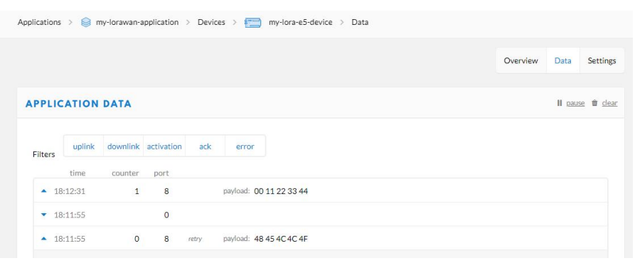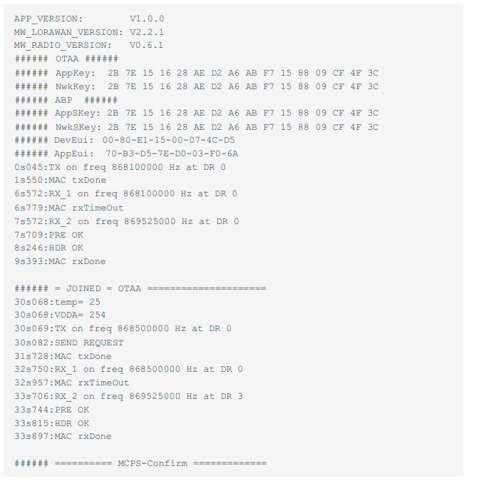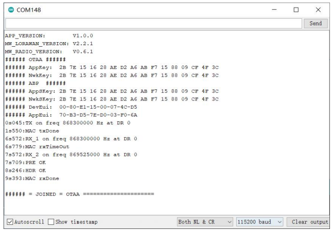 • If your LoRaWAN Gateway and TTN are set up, Wio-E5 will join successfully after a reset! A Acomfirm LoRaWAN package will be sent to TTN every 30 seconds. The following log will come out from the serial port if the join is successful: