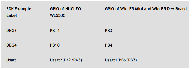 As the hardware design of the Wio-E5 series is a bit different from NUCLEO-WL55JC, the official STM32WL55JC development board from ST, developers need to reconfigure some GPIOs, to adapt the SDK example to the Wio-E5 series. We have already reconfigured gpios in this example, but we think itis  necessary to point out the difference.