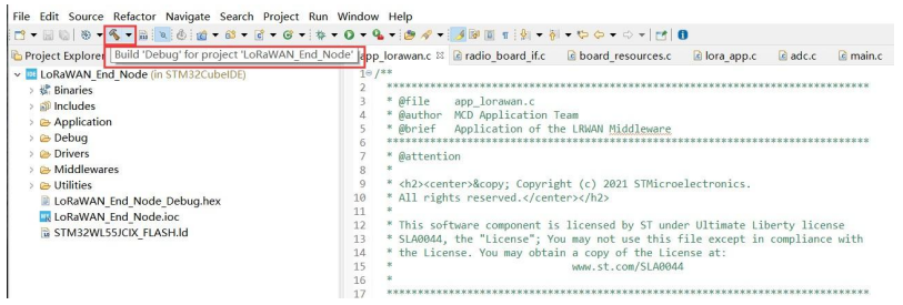 • Open the LoRaWAN_End _Node example with sTM32CubeIDE, by double click file LoRaWAN_End_Node\STM32CubeIDE\.project