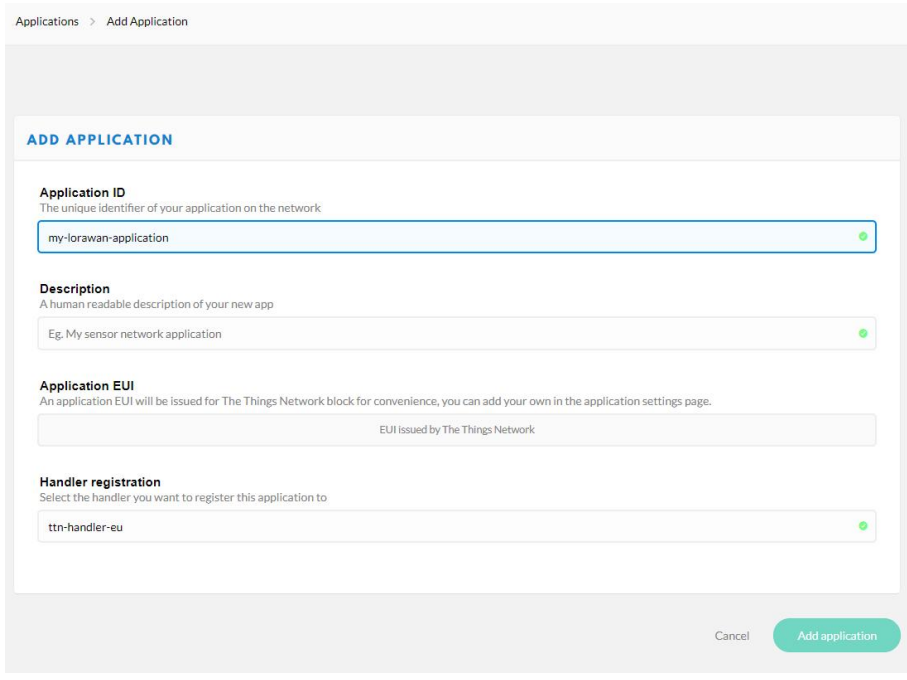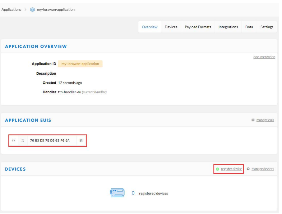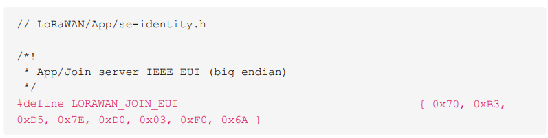 • Please follow the guide here to set up your TTN application, get yourApplicationl and copy it to the macro definition LORAWAN_JOIN_EUI in LoRaWAN/App/se-identity.h, for example, my Application EUI is 70 B3 DS 7E DO 03 FO 6A.