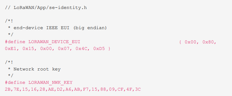 • Also, you can modify your DeviceEUI and Application Key, b setting the macro definition LORALORAWAN_DEVICE_EUI LORAWLORAWAN_NWK_KEYoRaWAN/App/se-identity.h, don’. Don’tt to ensure LOLORAWAN_DEVICE_EUInd LOLORAWAN_NWK_KEYre the same as the Device BUI and App Key in the TTN console.