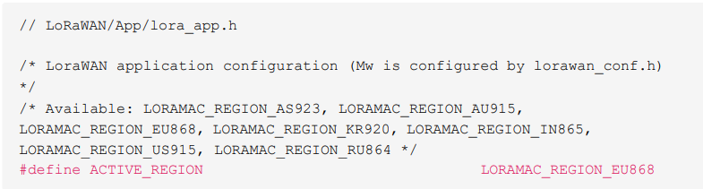 • The default LoRaWAN Region is EU868; you can modify it by setting the macro definition ACTIVE REGION in LoRaWAN/App/lora app.h