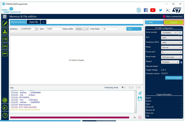 • After modification, please rebuild the example and program for your Wio-E5. Open STM32CubeProgrammer, connect ST-LINK to your PC, hold the RESET Button of your Device, then click connect and release the RESET Button.