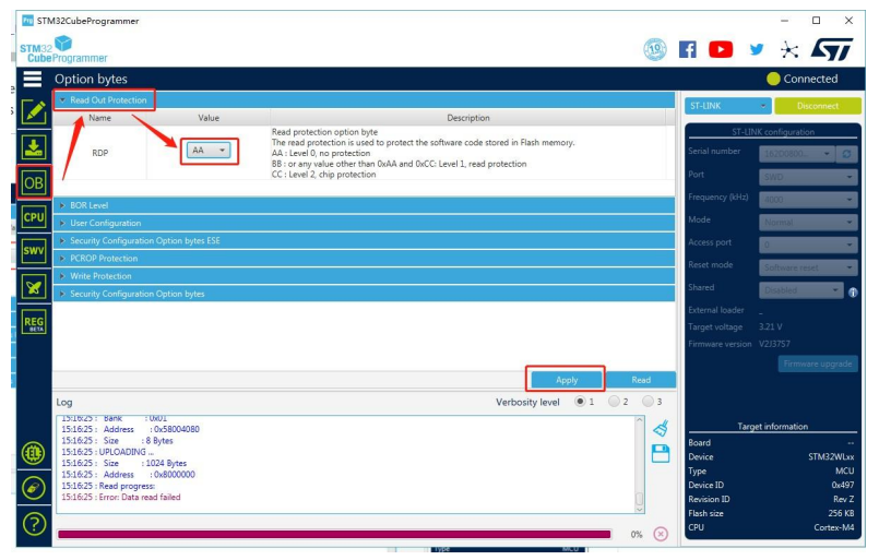 • Make sure the Read Out Protection is AA. If it is shown as BB, select AA and click Apply.