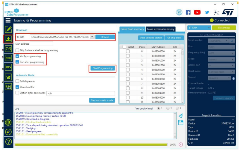 E: \en.stm32cubewl\STM32Cube_FW_WL_V1.0.0\Projects\NUCLB0-|  WLSSJC\Applications\LoRaWAN\LoRaWAN_End_Node\STM32CubeIDE\LoRaWAN_End_Node_D_ End Node_D ebug. hex ), select the programming options as the following picture, then click Start Programming! Oncethe  programming is finished,