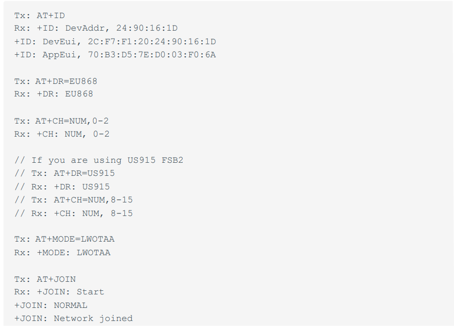 • AT+ID // Read all, DevAddr(ABP), DevEui(OTAA), AppEui(OTAA)