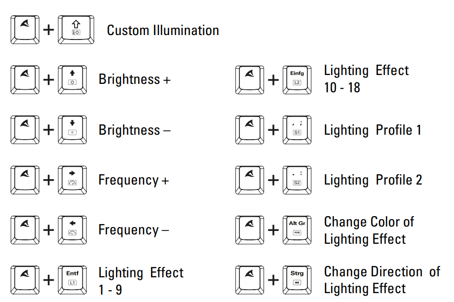 - Press the Fn + Lighting Profile 1 or Lighting Profile 2. Each of the two keys can save a lighting profile.