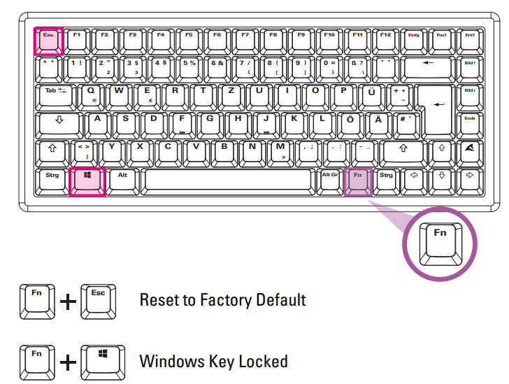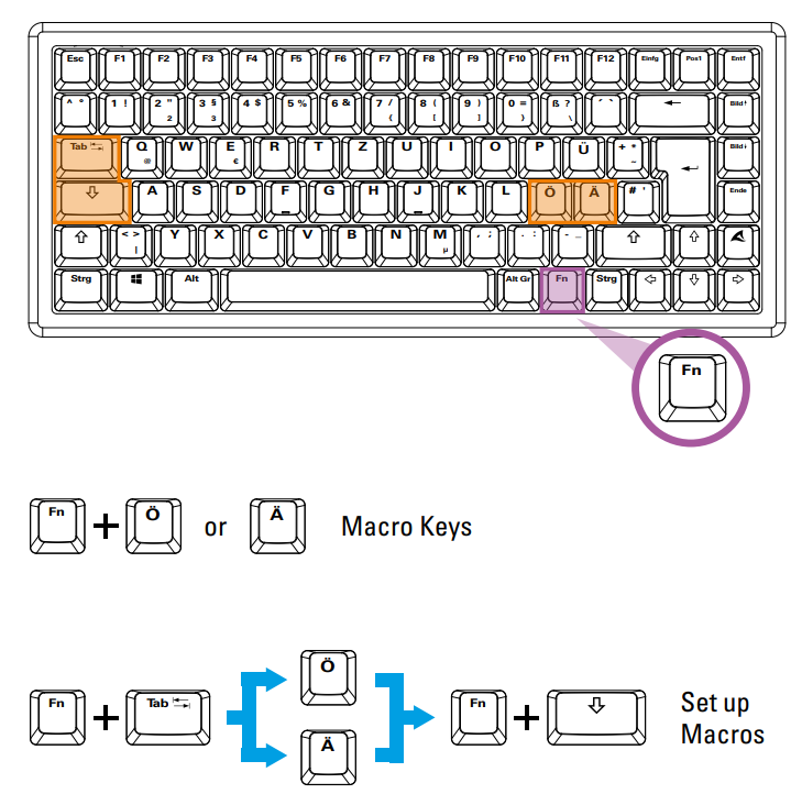 To record macros, first press and hold down the function key and then press the Tab key. Once you have done this, the macro keys Ö and Ä will start flashing. Press and hold down the function key and press one of these two macro keys to select it for macro recording. In the next step, first press and hold down the function key, and then press the Caps Lock key. The macro key you selected will now start to light up continuously.