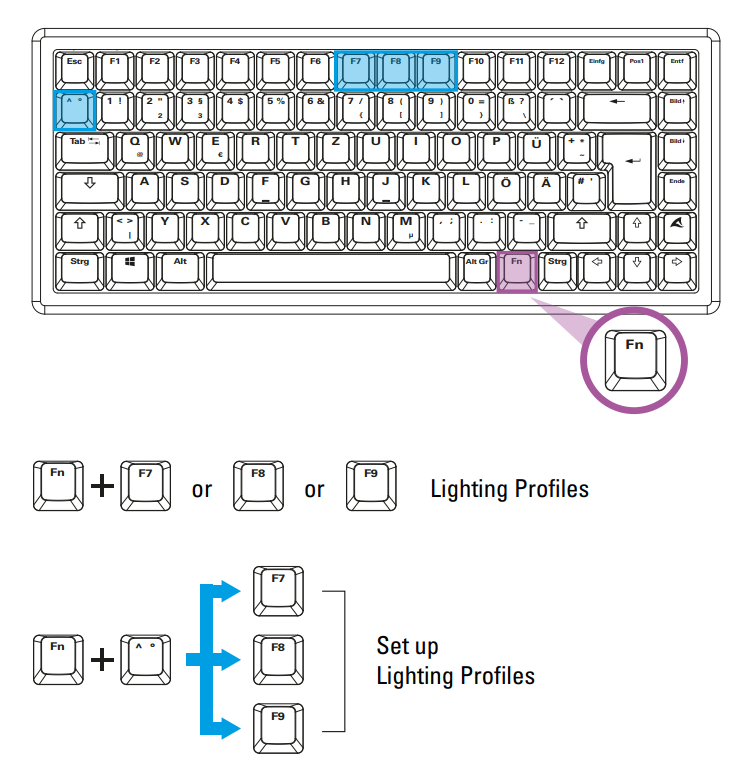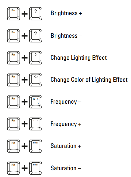 To set up or modify lighting profiles, first press and hold down the function key, and then also press the caret (^) key. Up to three lighting profiles Sharkoon SGK50 S3 Wood Barebone can be accessed separately via the F7, F8, or F9 key. These keys begin to flash. To choose one of these three profiles, press and hold down the function key again and then also choose and press one of the keys that are now flashing.