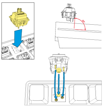 • Each pin on the underside of the switch should be pointing exactly to its relevant contact in the keyboard socket.