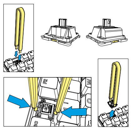 Before removing a switch, first remove the keycap. To do this, place the arms of the keycap puller tool either to the left or right or to the top or bottom of the keycap, and then pull the keycap upwards with careful but constant pressure. Whenever possible, avoid pulling the keycaps from the switch directly with your fingers, as this may damage the switch.