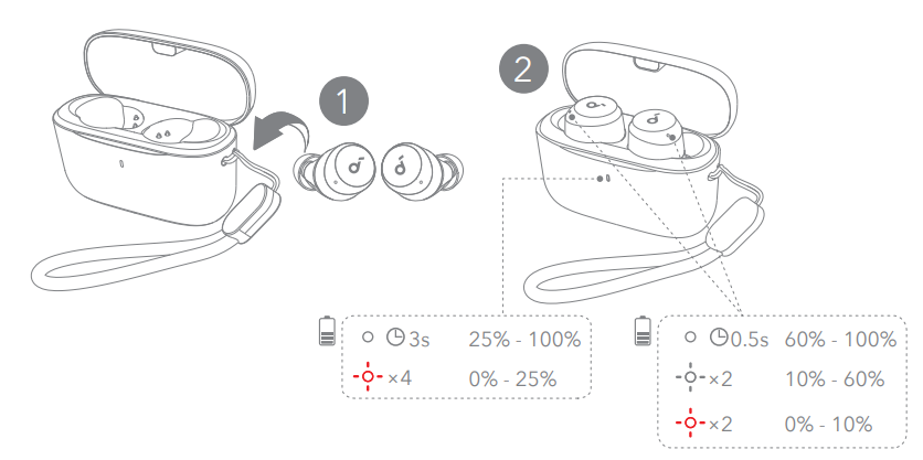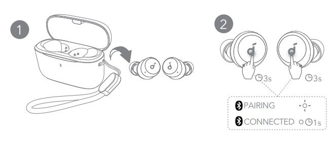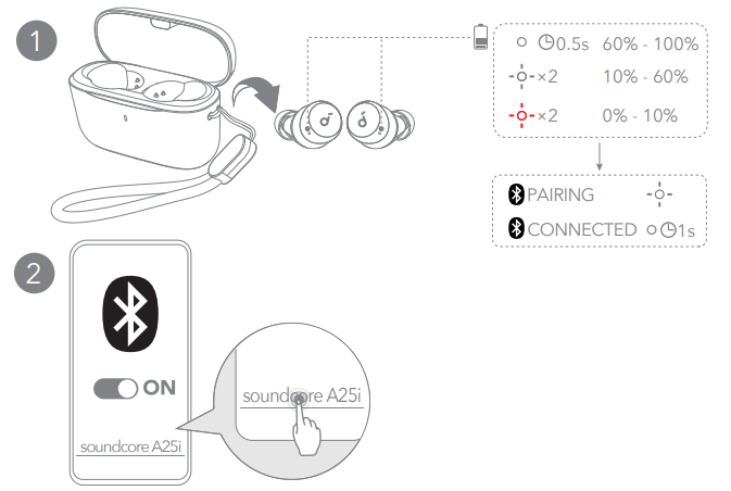 Open the charging case and take the earbuds out of the case. They will automatically power on and enter Bluetooth pairing mode. Select “Soundcore A25i” on your device’s Bluetooth list when connecting for the first time.
