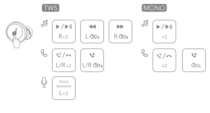 ×2: Tap twice 2s: Tap and hold for 2 seconds. You can also customise controls in the Soundcore app