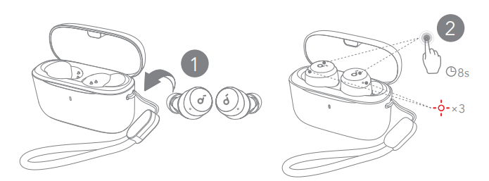 Reset if the earbuds have issues pairing with each other or with other devices. Place the earbuds in the charging case and leave the case open, then tap and hold the touchpads on both earbuds for 8 seconds until the earbuds’ LED indicators flash red rapidly three times