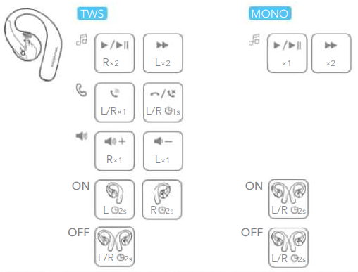 - To power on a single earbud, press and hold the button of the corresponding earbud for 2 seconds.