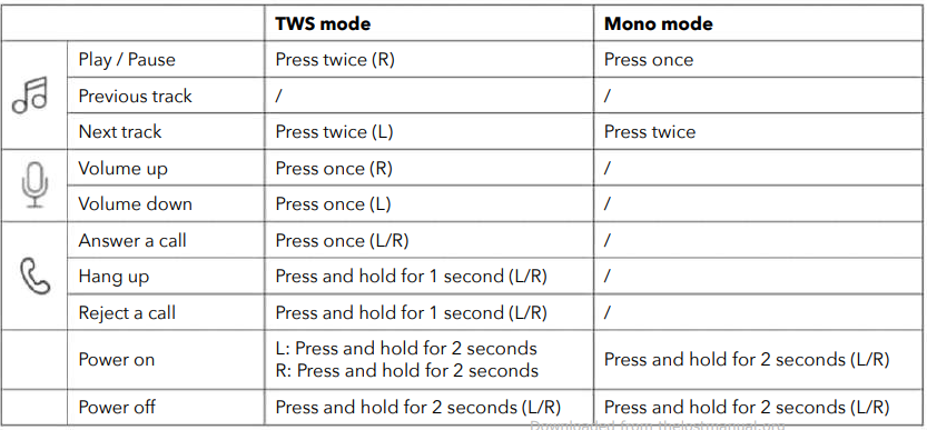- To power off both earbuds, press and hold the button of the left or right earbud for 2 seconds.