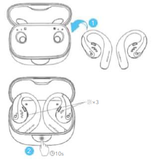 - Press down the button on the charging case and hold for 3 seconds until the LED indicators inside the case flash three times.