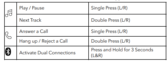 For power, play/pause, track skip, volume up/down, and call management, they employ physical button controls (one per earbud) rather than touch.