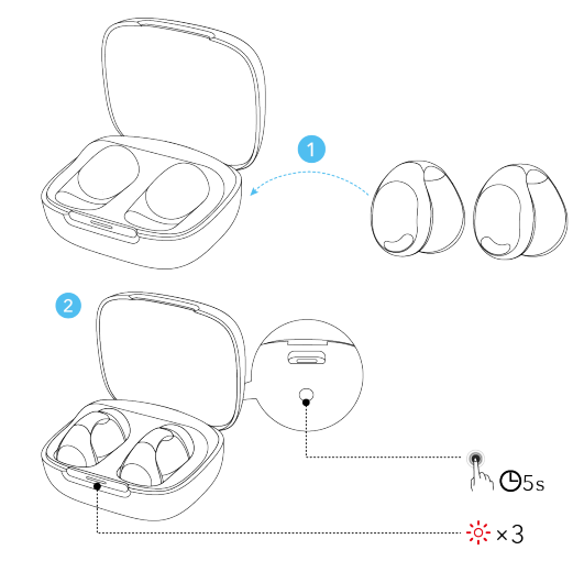 Place the earbuds in the charging case and leave the case open. Press and hold the charging case button for 5 seconds until the LED indicator flashes red slowly three times