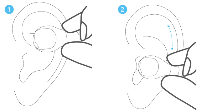 - Hold your ears with one hand, and gently clamp the earbuds onto the upper part of your auricles. Make sure the front side faces your ear canal, and the back side with the intuitive button rests behind your ear.