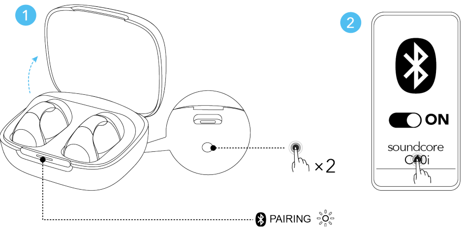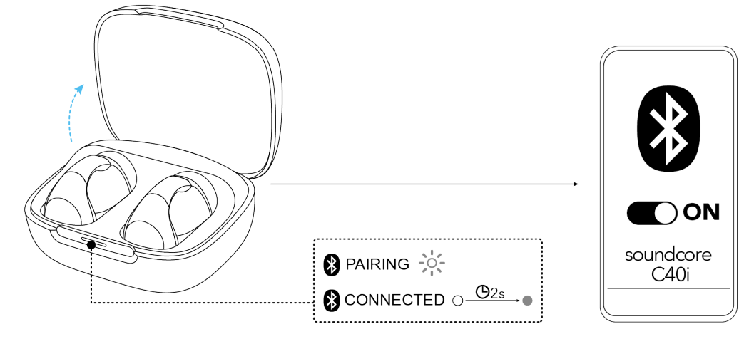 Open the case to power on the earbuds and enter pairing mode. Select Soundcore C40i” from your device’s Bluetooth list.