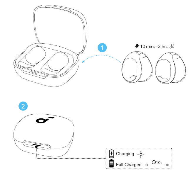 - 10 minutes of charging with the case offers 2 hours of playtime.