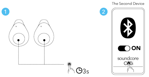 While wearing the earbuds, press and hold the intuitive button on both earbuds for 3 seconds until you hear a voice prompt to enter pairing mode. Then you can proceed to pair with the second device. Please note that if you attempt to connect a third device, the earbuds will automatically disconnect from the first device, as the earbuds can only connect to a maximum of two devices simultaneously.