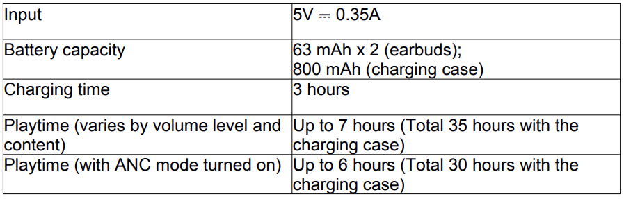 - The earbuds will automatically power off after 30 minutes if no device is connected.