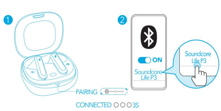 - Select “Soundcore Life P3” on your device’s Bluetooth list to connect. When successfully connected, the LED indicators on the charging case will turn white for 3 seconds.