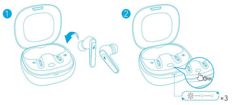 - Pairing with another device: Place the earbuds in the charging case and leave the case open. To enter pairing mode, press and hold the button on the case for 3 seconds until the 3 LED indicators flash white in sequence continuously.