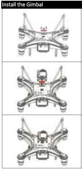 - Align the holes on the base of the gimbal to the bottom of the drone, and screw in to mount the gimbal. Make sure the camera is pointing to the front of the drone.
