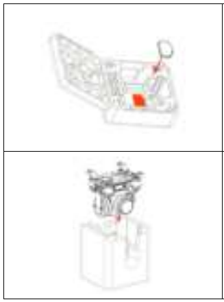 Remove the double-sided pad from the gimbal box and paste the pad into the drone’s case as shown to the left. After cleaning and drying the gimbal camera and the aircraft, secure the gimbal camera with the fixing case, then put the aircraft and other parts into the case. The case is secure and ready to be carried or transported.