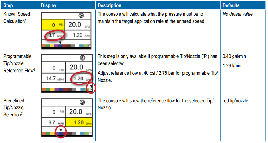 | Minimum Speed | ![]() | Set the minimum speed at which the console automatically shuts the boom sections off to eliminate an operator function when slowing to stop or turn around. There will be no spraying below this speed. When the sprayer speed exceeds the established Auto Master Off Speed, the boom sections turn back on. Set this value to “0” to disable. | 2.0 mph 3.0 km/h |
