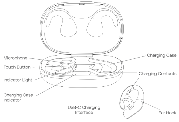 - Open the top cover of the charging case, and the earbuds will automatically enter Bluetooth pairing mode.