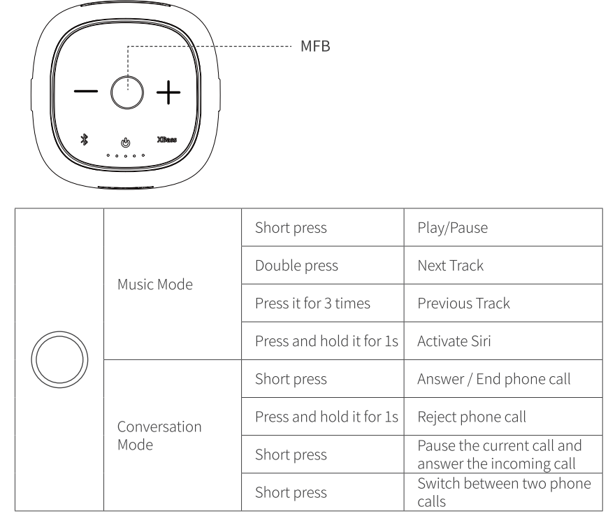 - Press and hold the Volume – and + button for 5s simultaneously to clear the pairing list and all settings, and the speaker will restore factory state.