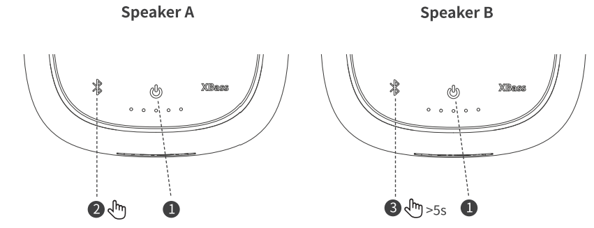 - Press and hold the $ button for 5s on any of the two speakers, then both will re-enter Bluetooth pairing mode.
