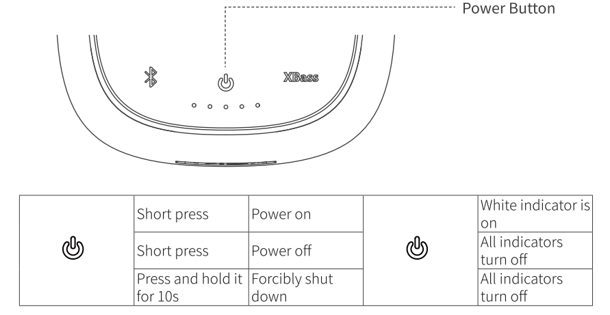 Press the XBass button to activate the XBass function, then the XBass indicator will glow white. “nt Press this button again to turn off the XBass function, and the XBass indicator will