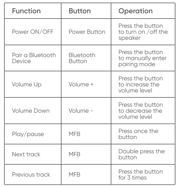 If this speaker has any problem, you can try to press and hold Volume + and Volume – buttons simultaneously for 5s to reset this speaker and remove the old pairing in your Bluetooth device, and then pair again.