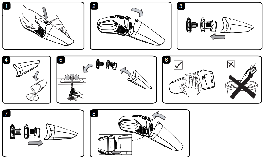 - Make sure the dust cup, the filter holder, and the reusable washable filter are clean and dry before using them again. DO NOT immerse the vacuum in water.