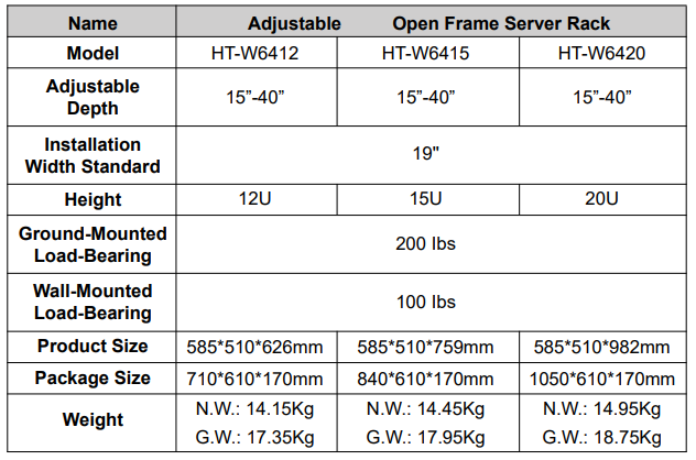 Servers, networking infrastructure, and other 19-inch rack-mounted hardware can be stored in the HT-W6412, an adjustable open-frame server rack. Excellent airflow and simple cable management are made possible by its open design.