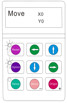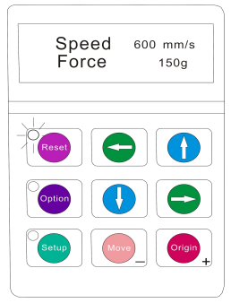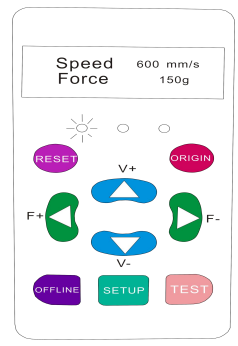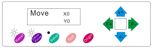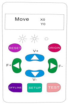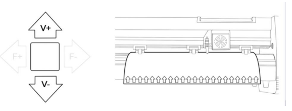 Used to test z-axis functionality (by dropping the blade down if the carriage is functioning properly) or to set a new origin point when the machine is in its Offline mode - V+ / V- BUTTONS