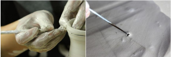 Scrape off excess clay from the mouth edge/remove air bubbles/punch holes.