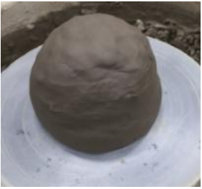 - Take out a proper amount of clay, throw the mud ball in the center of the wheel, and press it (wet your hands).