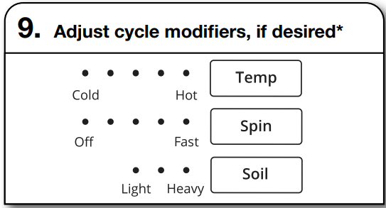 When you select a cycle, its default settings will light up. Touch to adjust cycle modifiers on the washer before touching START/PAUSE. Additional wash modifiers or options selected after touching START/PAUSE may not activate. Once a wash setting is selected, it is saved for the cycle selected. To return to factory default cycle settings, unpluthe g the washer for 30 seconds; then plug it back in. See “Cycle Guide” for default cycle settings.